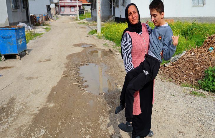 Bu sırada mahalle sakinlerinden Cemile Atay, hem zihinsel hem bedensel engelli evladı Ahmet Atay’ı (17) kucağında getirip, “Okul servisi buraya girmiyor. Her gün çocuğumu yola kadar kucağımda taşıyorum, hastalıklara kaldım” diyerek feryat etti.